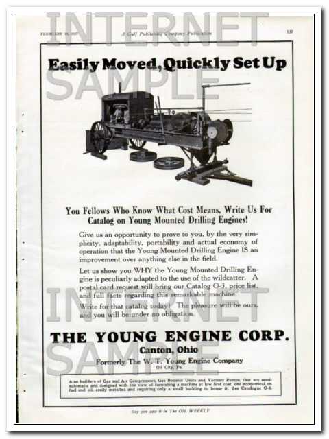 Original oil and gas trade magazine vintage ad for THE YOUNG ENGINE CORPORATION of Canton, OH. Formerly The W. T. Young Engine Company, of Oil City, PA. Easily Moved, Quickly Set Up. Young Mounted Drilling Engines. This unique 1927 oilfield petroleum drilling industry equipment magazine advertisement would display magnificently matted and framed.