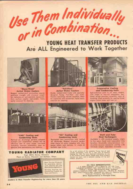 Original oil and gas trade magazine vintage ad for YOUNG RADIATOR COMPANY. of Racine, WI. Use Individually or in Combination, heat transfer products are all engineered to work together. For automotive, agricultural, industrial, gasoline and diesel engine applications. This unique 1953 old petroleum refining process industry equipment magazine advertisement would display beautifully matted and framed.
