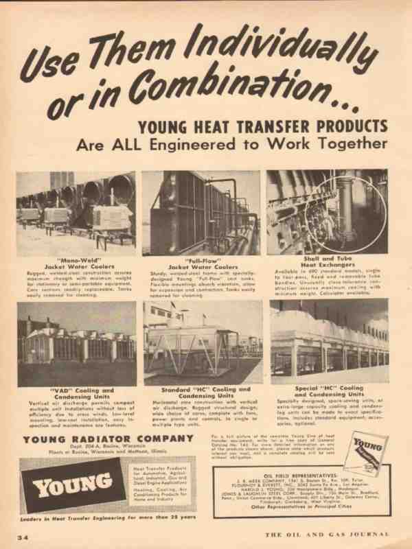 Original oil and gas trade magazine vintage ad for YOUNG RADIATOR COMPANY of Racine, WI. Heat Transfer Products are all engineered to work together. Mono-weld, Full-Flow Jacket water coolers, Shell and tube heat exchangers, VAS cooling and condensing units. This unique 1954 old petroleum refinery equipment industry magazine advertisement would display beautifully matted and framed.