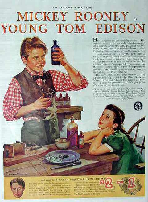 Original vintage magazine ad, YOUNG TOM EDISON. Starring Mickey Rooney. A Metro Goldwyn Mayer Picture. Supporting cast, Fay Bainter, George Bancroft, Virginia Weidler, Eugene Pallette. The ad is drawn and signed by Harold Anderson. Old 1940 movie advertisement.
