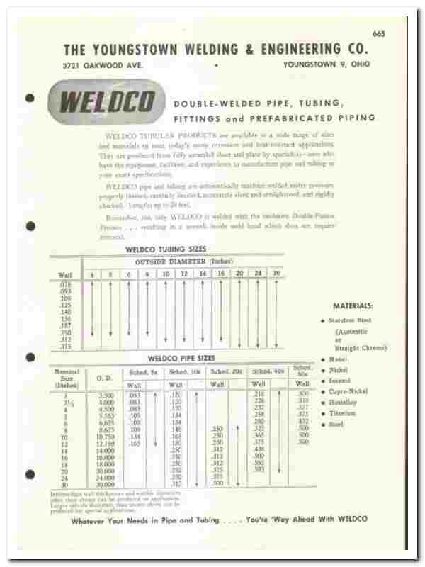 WELDCO Tubular Products are available in a wide range of sizes and materials to meet today's many corrosion and heat-resistant applications. They are produced from fully annealed sheet & plate by specialists; men who have the equipment, facilities and experience to manufacture pipe and tubing to your exact specifications. WELDCO Pipe & Tubing are automatically machine- welded under pressure, properly formed, carefully finished, accurately sized, straightened and rigidly checked. Lengths up to 24 feet.