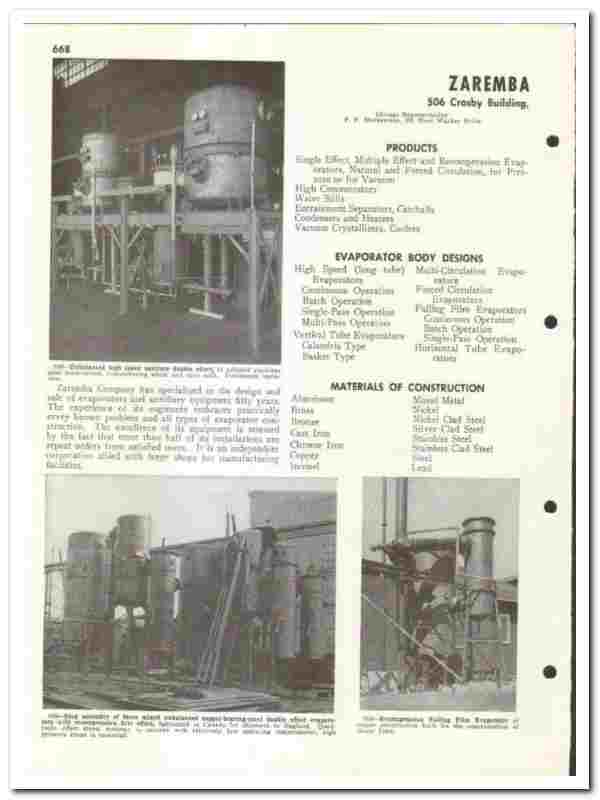 The Zaremba Company has specialized in the design and sale of evaporators and auxiliary equipment for fifty years. The experience of its engineers embraces practically every known problem and all types of evaporator construction. The excellence of this equipment is attested by the fact that more then half of its installations are repeat orders from satisfied users.