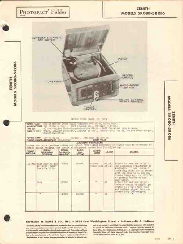 Vintage ZENITH model 5R080 and 5R086 combination Superheterodyne AM radio receiver with phonograph record player.Original old Sams Photofact manual includes schematic, layout, alignment instructions, voltage & resistance test charts, repair parts list and description. Dated 1946. 4 pages. This manual would make a sensational accompaniment to your classic retro radio / phono equipment.