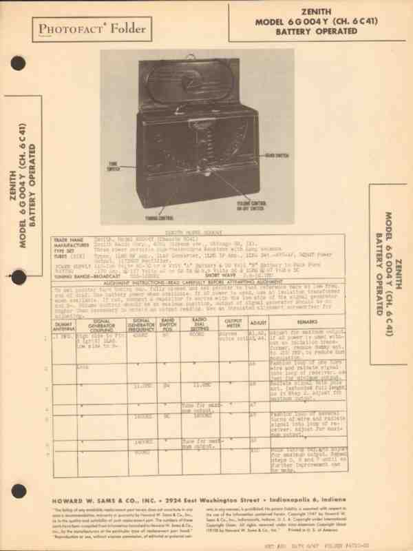 Vintage ZENITH model 6G004Y (Ch. 6C41) portable AM radio receiver. Original old Sams Photofact manual includes schematic, layout, alignment instructions, voltage & resistance test charts, repair parts list and description. 4 pages. Dated 1947. Zenith Radio Corporation of Chicago, IL. This manual would make a sensational accompaniment to your classic retro radio equipment.