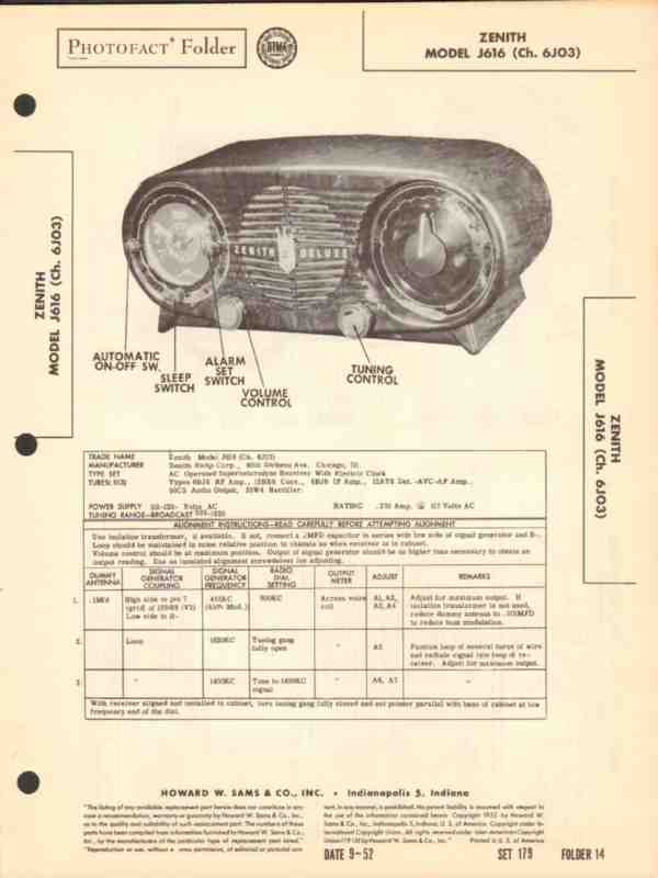 Vintage ZENITH model J616 (Ch. 6J03) 6 tube Superheterodyne AM radio receiver. Original old Sams Photofact manual includes schematic, layout, alignment instructions, voltage & resistance test chart, repair parts list. 4 pages. Dated 1952. This manual would make a sensational accompaniment to your classic radio equipment.