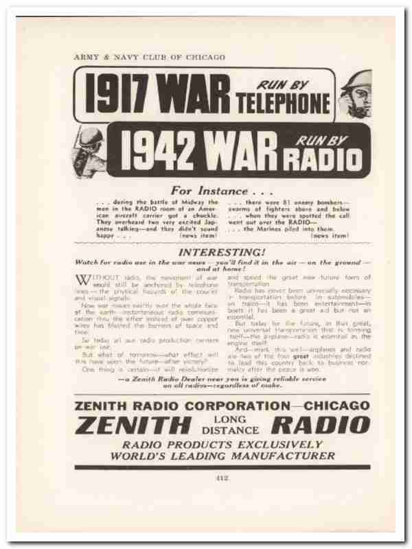 Original WW2 wartime vintage ad for ZENITH RADIO CORPORATION. War Run by Telephone in 1917, Run by Radio in 1942. During the battle of Midway the men in the radio room of an American aircraft carrier got a chuckle. They overheard two very excited Japanese talking and they didn't sound happy. There were 81 enemy bombers, swarms of fighters above and below when they were spotted the call went out over the radio, and the Marines piled into them.